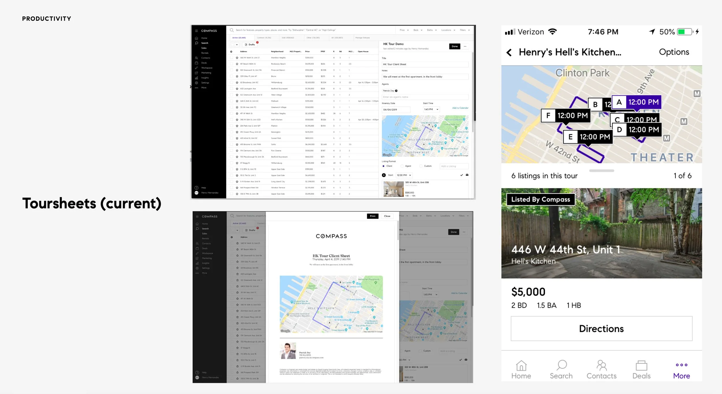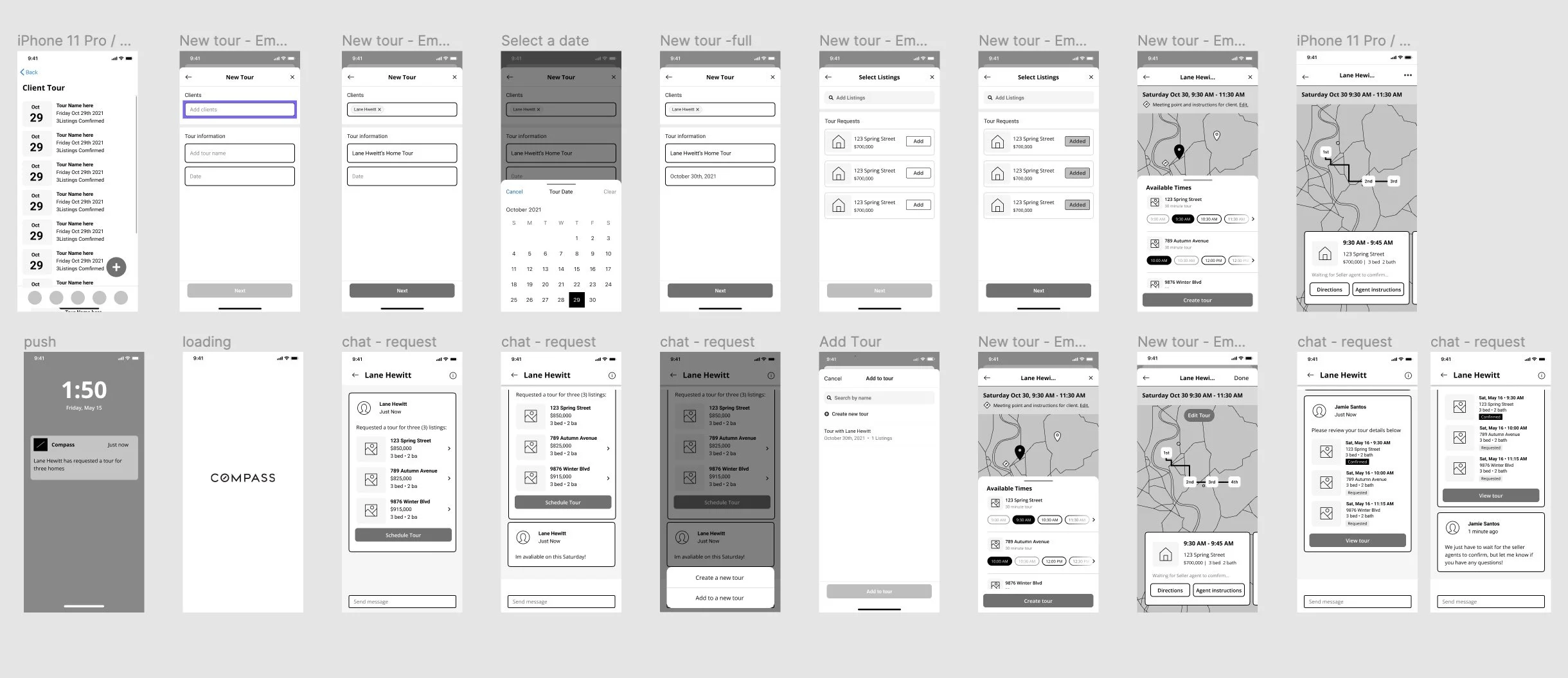 Property tours are crucial to the Buy-side workflow - the majority of home purchases require a buyer to tour several properties with an agent over an extended period of time. To meet current touring needs, agents used a variety of software solutions (eg MLS, ShowingTime) across many platforms, including competitor products. We wanted to integrate all these features within the Compass product so that agents (and their clients) could seamlessly schedule, organize, and prepare for property visits without leaving the Compass platform.